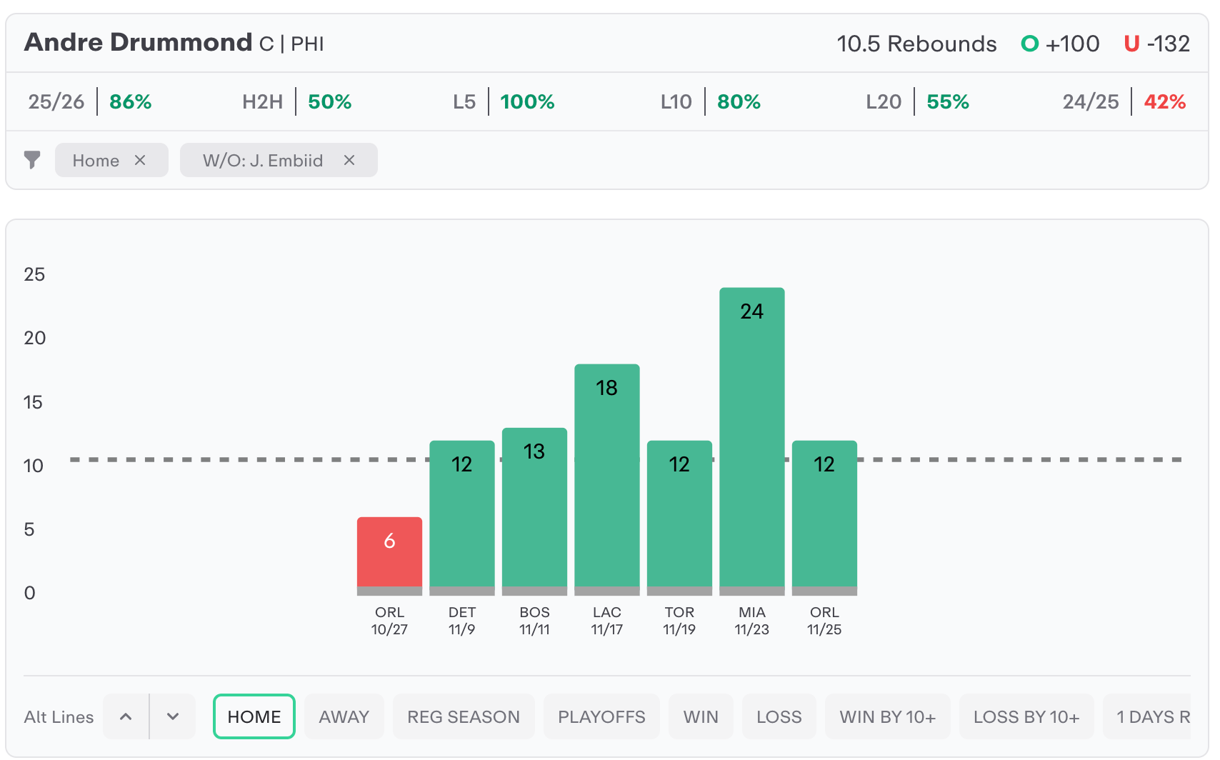 Drummond is day-to-day, but he participated in shootaround this morning. In games without center Joel Embiid this season, Drummond’s cashed the over in six of seven at home.