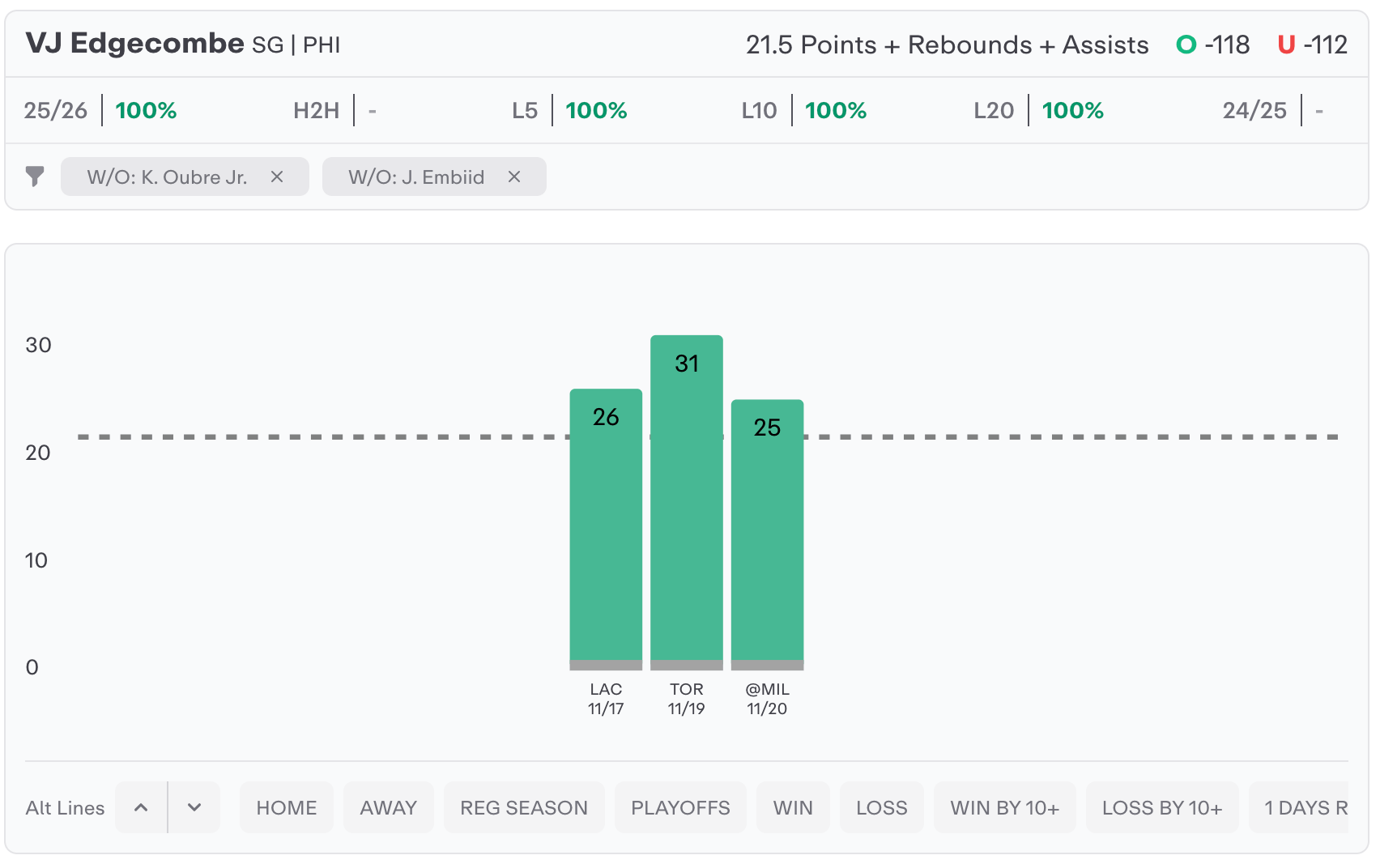 Edgecombe is averaging 23.3 points + rebounds + assists in four games without shooting guard Kelly Oubre Jr. He’s gone over his PRA in all three games without Oubre Jr. and Joel Embiid on the floor. The Wizards defense is terrible. They’ve allowed the most points per game, the most rebounds per game and second most assists per game to their opponents. Washington’s also on the second leg of a back-to-back.